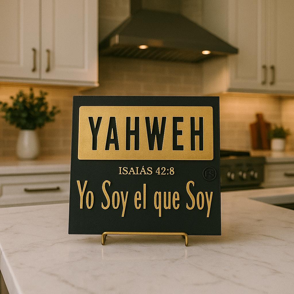 La placa con el mensaje “YAHWEH YO SOY EL QUE SOY” representa una de las revelaciones más profundas y trascendentales de Dios en la Biblia (Éxodo 3:14). Este poderoso nombre divino expresa la eternidad, la autosuficiencia y la soberanía absoluta de Dios, recordándonos que Él existe por sí mismo y es inmutable en su naturaleza.